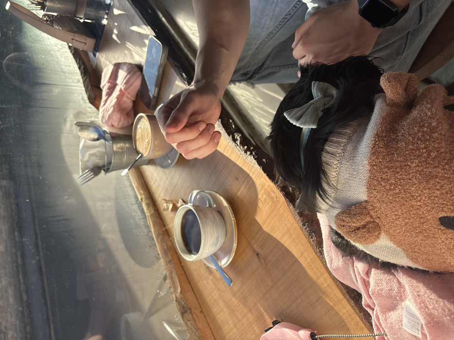 On a rustic wooden table, a casual scene unfolds. A person's hand hovers near a cup of coffee, next to a mug of latte, and a small metal container with utensils. A cell phone and pink yarn sit nearby. Another person wears jeans and a watch, while a small dog is wrapped in a pink outfit and a brown teddy bear costume.
