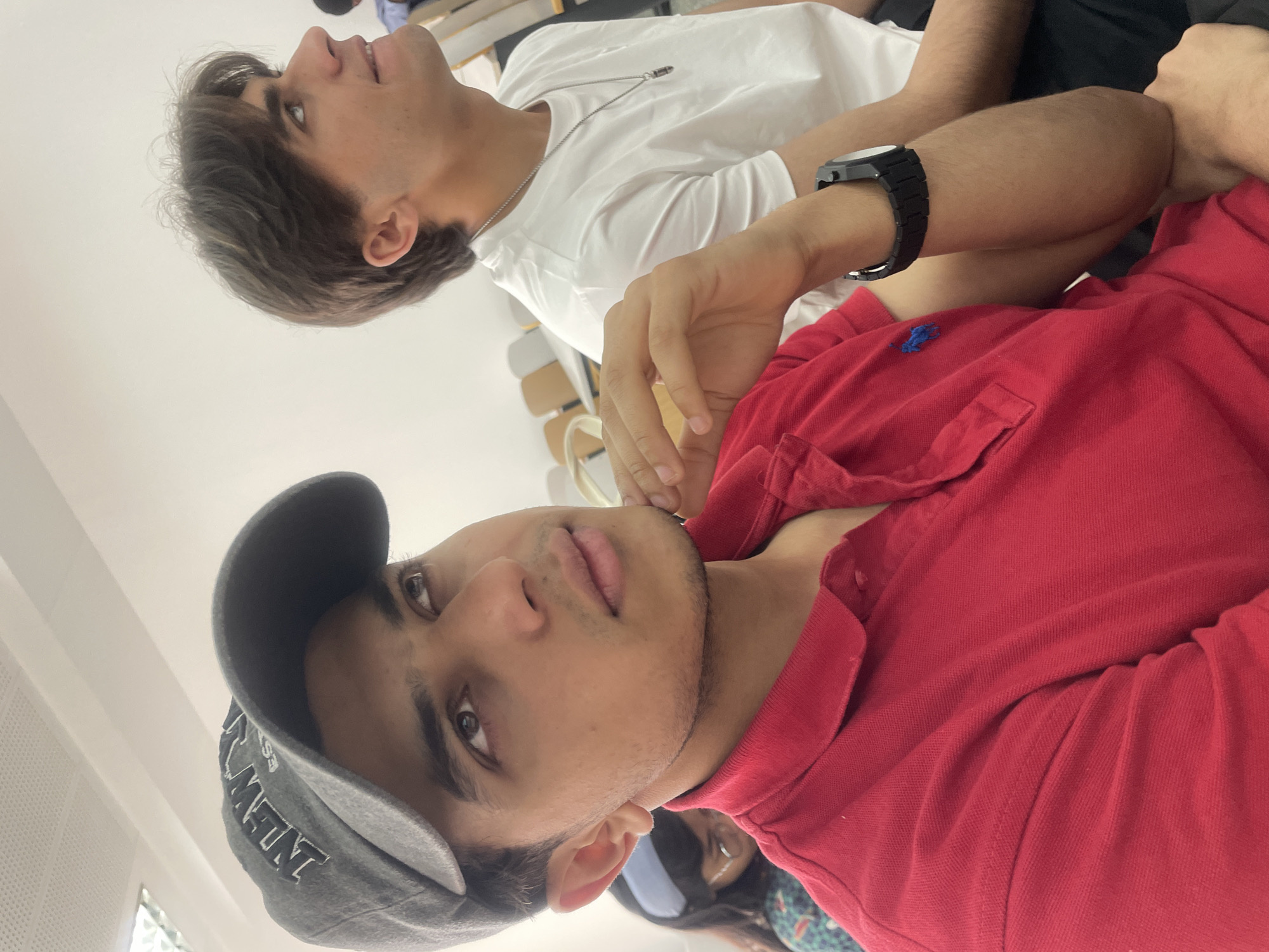 Two young men are sitting near each other indoors. One is wearing a red collared shirt and a grey baseball cap. The other is wearing a white t-shirt and a silver necklace. The location is not clear.