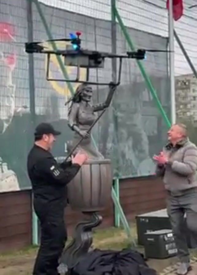 The video captures the unveiling of a bronze sculpture of a woman, appearing as a witch, by a drone. The sculpture depicts a slender woman with flowing hair, seated atop a barrel, holding up a broom. Two men are present: one in a black uniform with a Ukrainian flag patch stands beside the sculpture, and the other is dressed in a gray jacket and pants. They both clap and express excitement as the drone lifts a black cloth, revealing the statue. The drone, a quadcopter with blue and red lights, hovers overhead during the unveiling. The setting appears to be an outdoor area, with a fence, greenery, and buildings visible in the background. A flag is seen waving in the distance. Several black Marshall boxes and a blurred mural add to the surrounding context.
