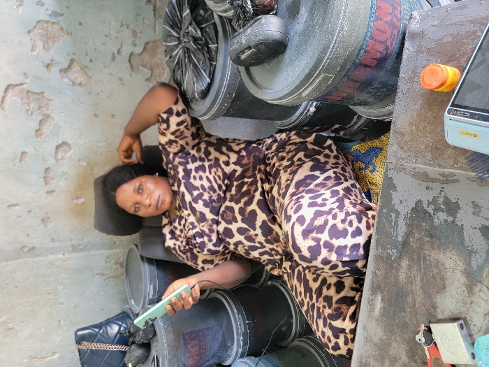 In Maiburiji, Nigeria, a single adult female is seated in a dark-colored chair within an indoor environment characterized by distressed, light-colored walls with peeling paint. The subject, possessing dark hair and a light complexion, wears a long-sleeved top and matching trousers with a prominent leopard print pattern. Her left hand holds a light green smartphone, which has a white earphone cable connected. Her right arm is bent, with her hand resting on the back of the chair, near her head. She is looking towards the left side of the frame. The immediate surroundings include several dark-colored buckets or containers, some stacked. One bucket behind her left shoulder has a black quilted handbag resting on it. Another bucket behind her on the left has partial text "DRY FEEDING" visible. To her right, a black plastic bag is placed on a bucket, and a black computer mouse rests on an adjacent container which shows "HARMON" partially visible. In the foreground, a dark, flat, possibly metallic surface serves as a table. On this surface, from left to right, are a silver padlock, a red lighter, a small orange-capped bottle, and a light blue mobile phone. A blue and yellow patterned fabric is partially visible beneath the woman's legs. No other individuals are present, and no direct interactions are depicted.