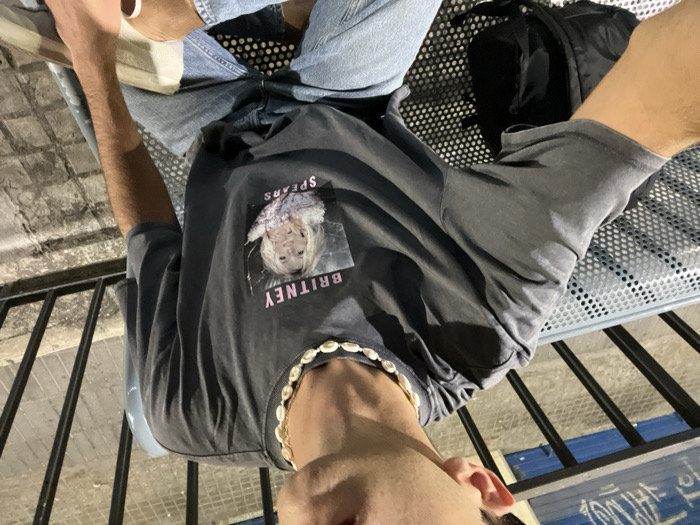 A high-angle image depicts an individual seated on a light grey perforated metal bench in Torrent, Spain. The person is wearing a faded dark grey t-shirt featuring a central graphic of Britney Spears with "BRITNEY" above and "SPEARS" below in pink lettering. A necklace made of small, light-colored cowrie shells is visible around the neck. The individual also wears light blue denim jeans, with a light-colored shoe resting on their lap. A black backpack is partially visible on the left side of the bench. The background reveals a black metal railing, concrete paving, and a distant wall or surface with graffiti, all illuminated by artificial light, indicating a nighttime setting.