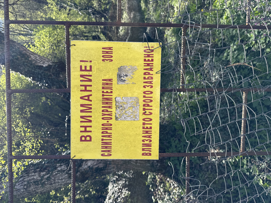A yellow sign with red lettering reading "Внимание!" (Attention!) and "Санитарно-охранителна зона" (Sanitary-security zone) is posted on a metal fence