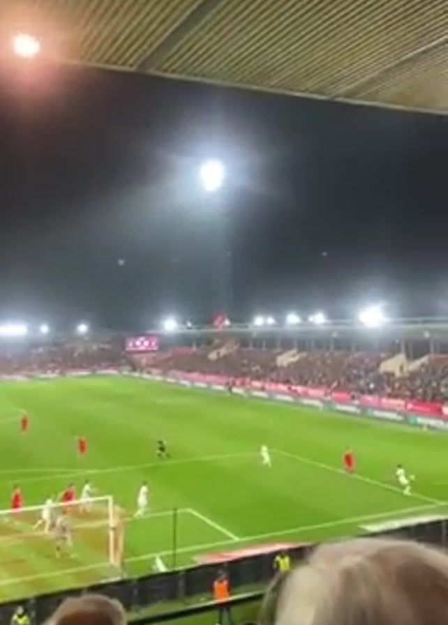 live soccer match at night, viewed from the stands. The field is well-lit with artificial lights. Players in red and white jerseys are actively engaged in the game. A goal post is visible at one end of the field. Spectators fill the stands.