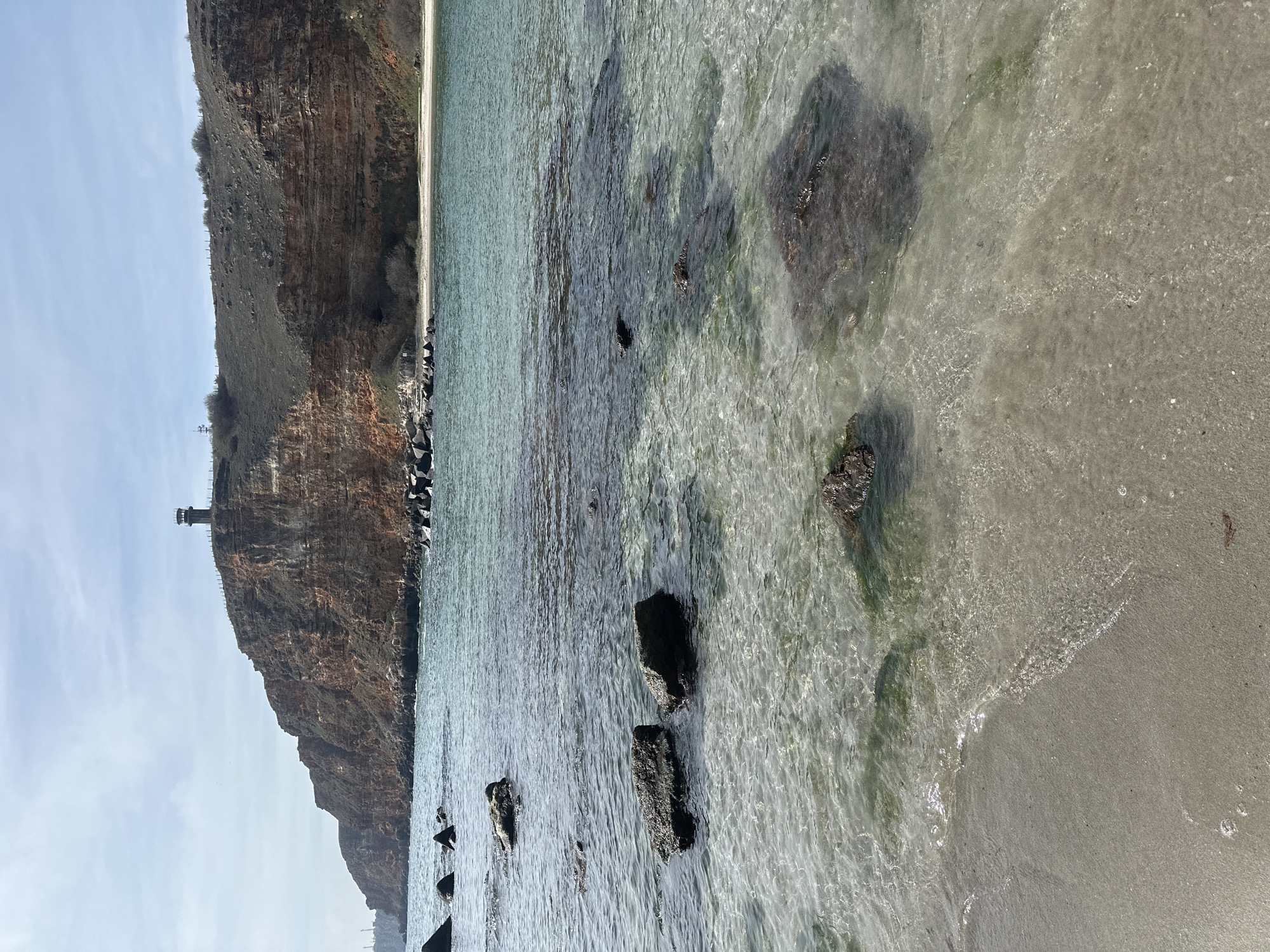 The image depicts a coastal scene in Balgarevo, Bulgaria, under natural daylight. The foreground features a light tan sandy beach transitioning into clear, shallow water with gentle ripples. Several dark, algae-covered rocks are partially submerged, visible through the translucent water. In the midground, the water deepens, shifting from clear to a turquoise-green, with additional submerged rocks and a cluster of angular, dark rock formations (possibly part of a breakwater) visible towards the left. A small, lighter sandy cove is discernible at the base of the cliffs further in the distance on the right. The background is dominated by a rugged, multi-layered cliff face composed of reddish-brown and darker rock, rising steeply from the water. The top of the cliff is covered with sparse, dry-looking vegetation, with a faint fence line visible along the edge. Perched on the highest point of the cliff, towards the right, is a dark, open-framework observation tower with multiple levels. Distant industrial structures are faintly visible on the far left horizon. The sky is light blue with scattered thin white clouds. No human figures or discernible actions are present in the scene.