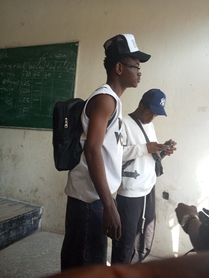 The scene depicts three individuals within an indoor setting resembling a classroom or educational facility in Ihiagwa, Nigeria. In the left mid-ground, a male subject is shown in profile, facing right. He wears eyeglasses, a black and white mesh trucker hat with a white logo, a white sleeveless top with a dark graphic, and dark trousers. A black backpack is worn on his back. To his right, another male subject stands, focused downwards on a dark-colored smartphone held in both hands. He wears a dark blue baseball cap with a white "NY" logo, a white long-sleeved sweatshirt with a stylized black design on the front, and dark trousers with a white drawstring. A black shoulder bag strap is visible across his torso. In the immediate foreground, lower right, a blurred hand and forearm, adorned with a silver-banded watch, are partially visible. The background consists of a light-colored, possibly off-white, wall. On the far left, a dark green chalkboard displays white handwritten calculations and a table, including data such as "G = 48cm," various numbers (e.g., "110 42 36 6"), and fragmented text. A dark, rectangular, elevated surface is present in the lower left foreground.