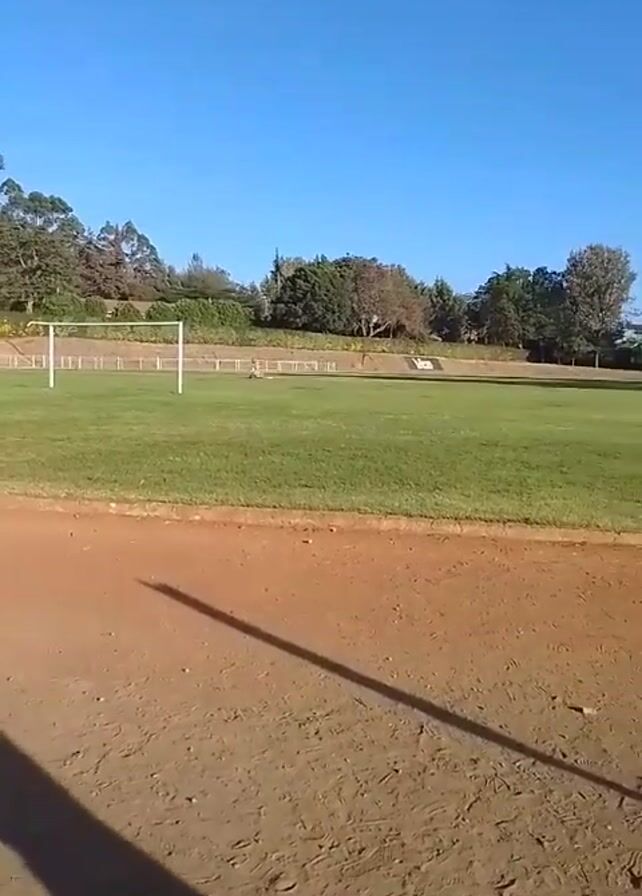 dirt running track surrounding a grass soccer field. There are trees in the background. Three men in athletic wear, maroon and teal, are running on the dirt track. The sky is bright blue.