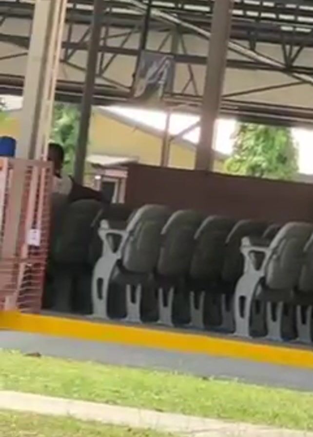 covered outdoor area with rows of black chairs. People are sitting in some of the chairs. There are speakers hanging from the ceiling and a small green plant on the lawn in front of the seating area. The camera pans across the scene, showing more of the seating and the surrounding green lawn and trees. The video appears to be taken from a moving vehicle.