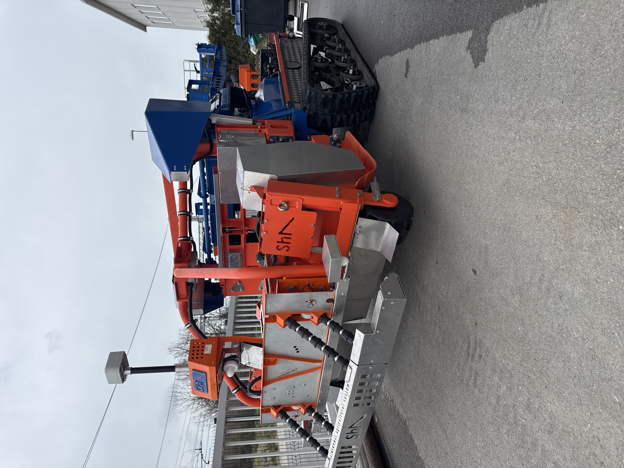piece of heavy machinery or equipment, possibly agricultural or industrial, located outdoors on what appears to be a paved road or parking area. The color scheme of the machine is primarily orange, silver, and blue. It features complex mechanical structures, including tracks and what seem to be sensor systems or control panels. The equipment is standing near a building or structure, which indicates that it could be in an industrial area. Based on the title, we can place the machinery in Logatec, Slovenia.