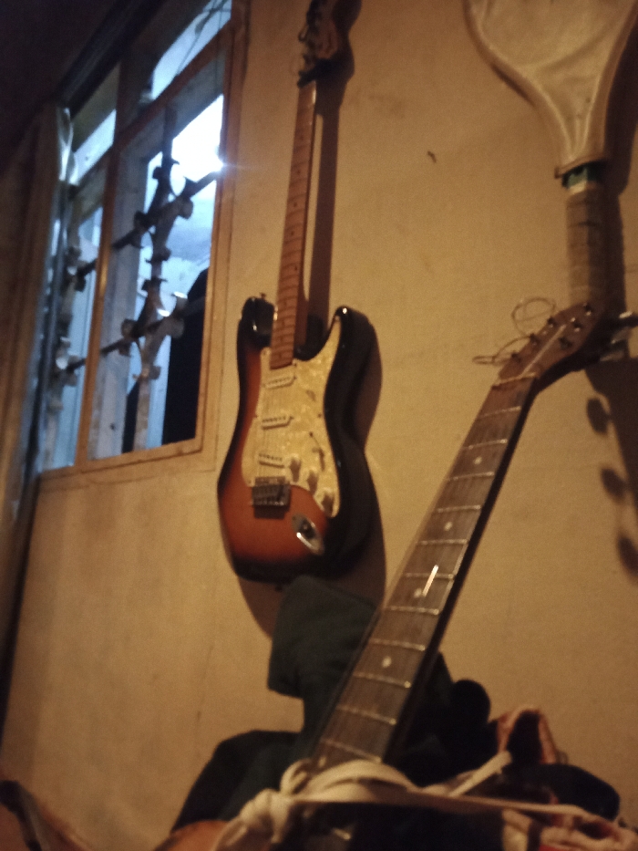 The image depicts an interior scene in Ciherang, Indonesia, dimly lit with a strong external light source entering through a window. The primary subjects are musical instruments and a racket displayed against a light-colored wall. On the upper left, a multi-pane window with a wooden frame and ornate dark metal security bars is visible, through which a bright, possibly artificial, light source is prominent. Centered on the wall, a sunburst-finish electric guitar, resembling a Fender Stratocaster, hangs vertically. It features a three-tone finish (dark, reddish, dark), a white-patterned tortoiseshell pickguard, three single-coil pickups, and chrome hardware. To its upper right, part of a racket, likely tennis or badminton, is visible, with its head covered in white fabric and its handle wrapped with a dark grip. In the foreground, angled upwards from the bottom right, is the neck and headstock of an acoustic guitar. It has a brown wooden neck with a fretboard showing dot inlays and tuning pegs on the headstock. The body of this guitar is largely obscured by dark fabric, possibly clothing, and a white strap or cord coiled in the immediate foreground. No individuals are present in the scene.