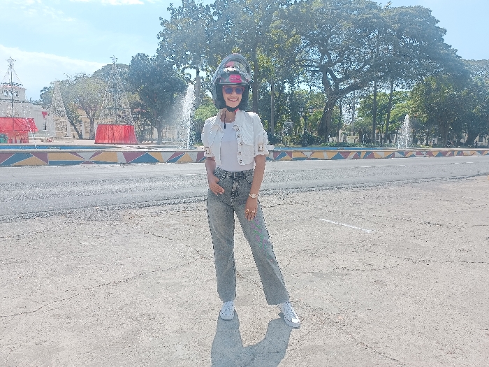 A woman in a motorcycle helmet, sunglasses, a white jacket, and gray jeans stands in a park-like setting. Behind her is a colorful fountain, decorative structures, trees, and a blue sky. The ground is paved and gray. She wears white sneakers and a watch on her left wrist, with rings on her right hand. Her shadow is visible on the pavement.