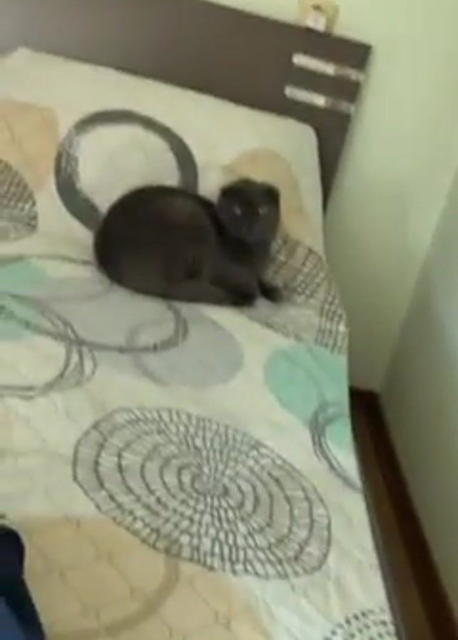 dark gray Scottish Fold cat resting on a bed with a geometric-patterned cover