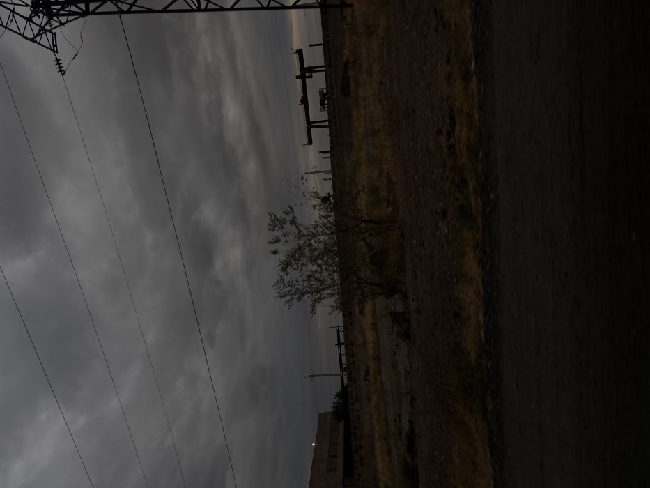 The image depicts an outdoor, undeveloped or industrial area in Vagharshapat, Armenia, under a dark, uniformly overcast sky. Multiple thin, parallel power lines traverse the upper portion of the frame. On the far right, a dark, metal lattice electricity pylon extends vertically, partially cropped. In the mid-ground, on an elevated embankment, a large, dark, skeletal gantry-like industrial structure is visible. To the far left, a light-colored, multi-story building with dark, rectangular windows is partially cropped. The terrain consists of dry, uneven ground with patches of sparse, yellow-brown vegetation. A small, sparsely leafed tree or large bush stands slightly left of center in the mid-ground. A slender utility pole is visible between the building and the gantry. The immediate foreground is a dark, undifferentiated dirt surface. No individuals are present, and no actions or interactions are depicted.