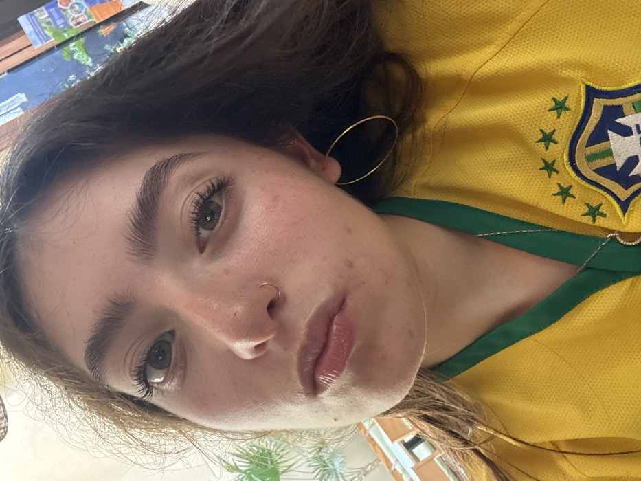 A fair-skinned woman is photographed in a close-up, slightly angled shot. She has dark hair, thick eyebrows, and appears to be wearing light makeup. A small gold nose ring is visible on her left nostril, and she is wearing a large gold hoop earring on her left ear. She is wearing a yellow jersey with green trim around the collar and a shield with green stars and a blue globe on the right side of the frame. A delicate necklace hangs around her neck.