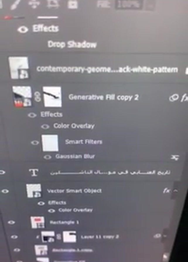 close-up view of a computer screen displaying the layers panel in Adobe Photoshop. The screen resolution is sufficient to discern numerous layers, effects, and smart objects, indicating a complex image editing project. The layers range from image files, text layers in Arabic, and vector smart objects to effects like color overlays, drop shadows, Gaussian blur, and smart filters. The opacity and fill are at 100%. The screen's date is visible as 10/26/2023.