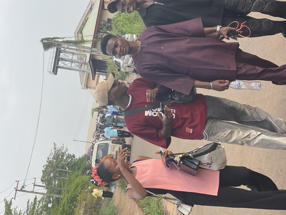 A group of four young people is seen standing on a street, with a large crowd of people and a van in the background. The person in the front is wearing a pink top and black pants and appears to be speaking on a phone. Behind them, a person is wearing a maroon T-shirt with gray pants and a black bag. Next, a person is in a purple top and dark pants. The last person is wearing a black jacket and hat with patterned pants. A water tower and building are visible in the background.