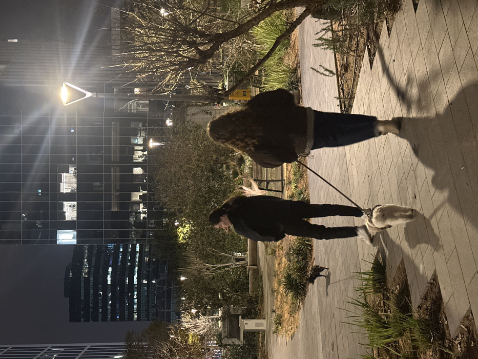 - "At night, two people walk a dog along a sidewalk" by FM-OecyI3, licensed under CC BY 4.0