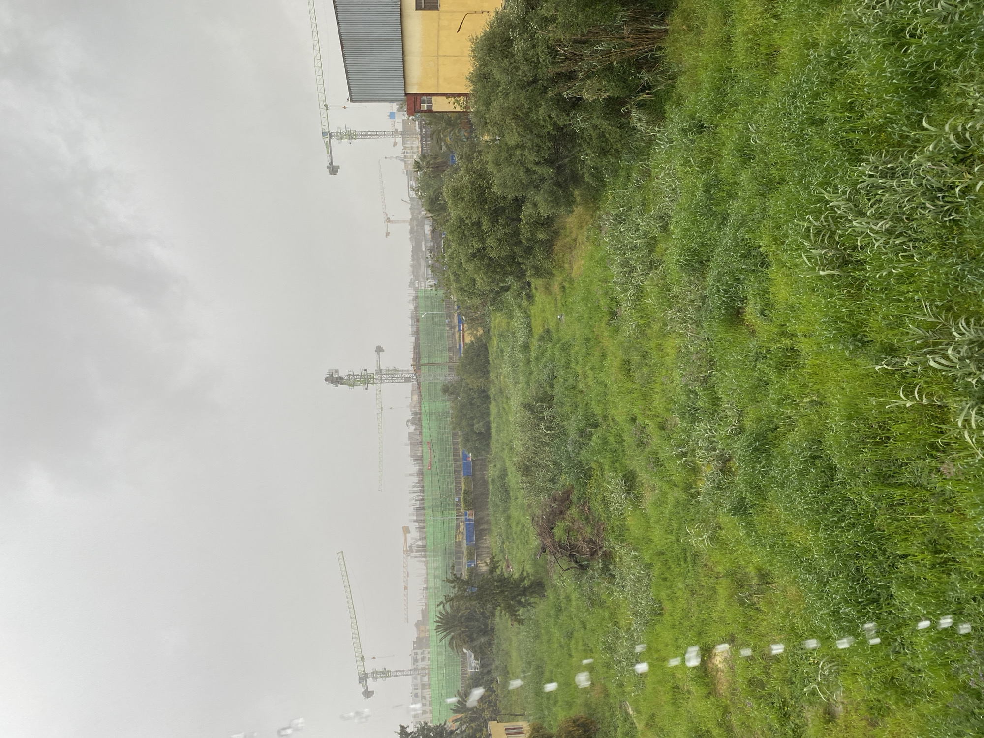 view of a grassy field and a construction site in Baraki, Algeria. Numerous construction cranes are visible in the background, shrouded in fog. A yellow building stands to the left of the trees. The foreground is dominated by dense green vegetation. The sky is overcast and there are traces of rain on the lens.