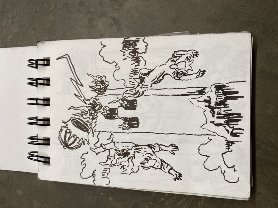 A pen sketch depicts two figures falling amidst chaos. One is near a lightning bolt and what seems to be a crown, while the other falls towards turbulent lines. The drawing has a rough, expressive style, capturing a dramatic or catastrophic scene. The background includes clouds, or possibly fire, adding to the sense of danger.