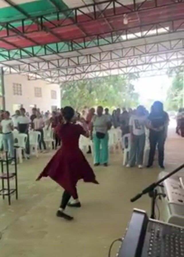 worship service taking place under a sheltered area with a metal roof. In the foreground is a sound mixing console and a microphone stand. A woman in a red dress and black pants is dancing in front of a congregation of people. Most of the people are standing in rows behind white plastic chairs, with some raising their hands. The building behind them has white walls with regularly spaced square windows. The surrounding area visible through the windows is green with trees and foliage.
