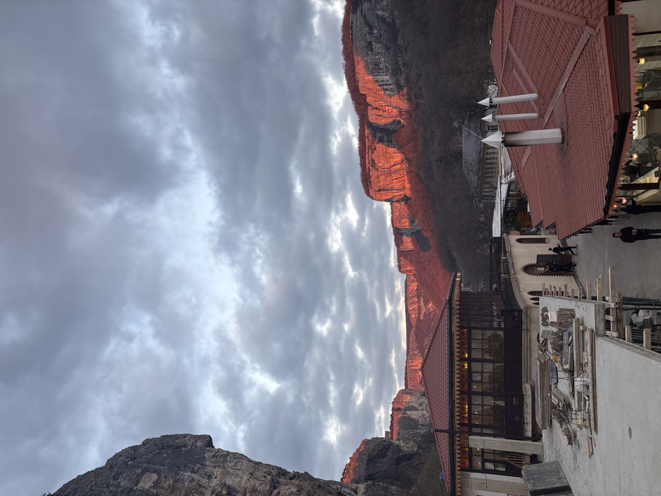 The image displays a valley in Bakhchysarai, Ukraine, under a heavily clouded sky, depicting conditions consistent with late afternoon or early evening. The sky is largely grey with brighter, diffused light visible through breaks in the clouds. Prominent limestone cliffs dominate the background and left side. The extensive cliff face on the right is illuminated by a strong, reddish-orange light, indicative of a low-angle sun. The slopes below these cliffs are covered with a dense growth of bare deciduous trees. In the midground, a two-story building with a red tiled hip roof features a wrap-around second-story balcony with ornate dark wood railings and large windows on its lower level. To the immediate left and foreground of this building, an active construction site is visible, with concrete slabs, exposed rebar, and various building materials present. To the right, another building with a red tiled roof and multiple white conical ventilation chimneys or decorative elements is partially visible, suggesting a commercial establishment with an illuminated outdoor area. A paved pathway or courtyard runs between these structures. Several individuals are present on this pathway: one figure stands near the construction area, another two walk away from the viewer near an entrance to the left-hand building, and one more is positioned further down the path, near the right-hand building. No specific actions or interactions beyond general movement are discernible. The scene combines natural geological features with architectural elements and ongoing development.