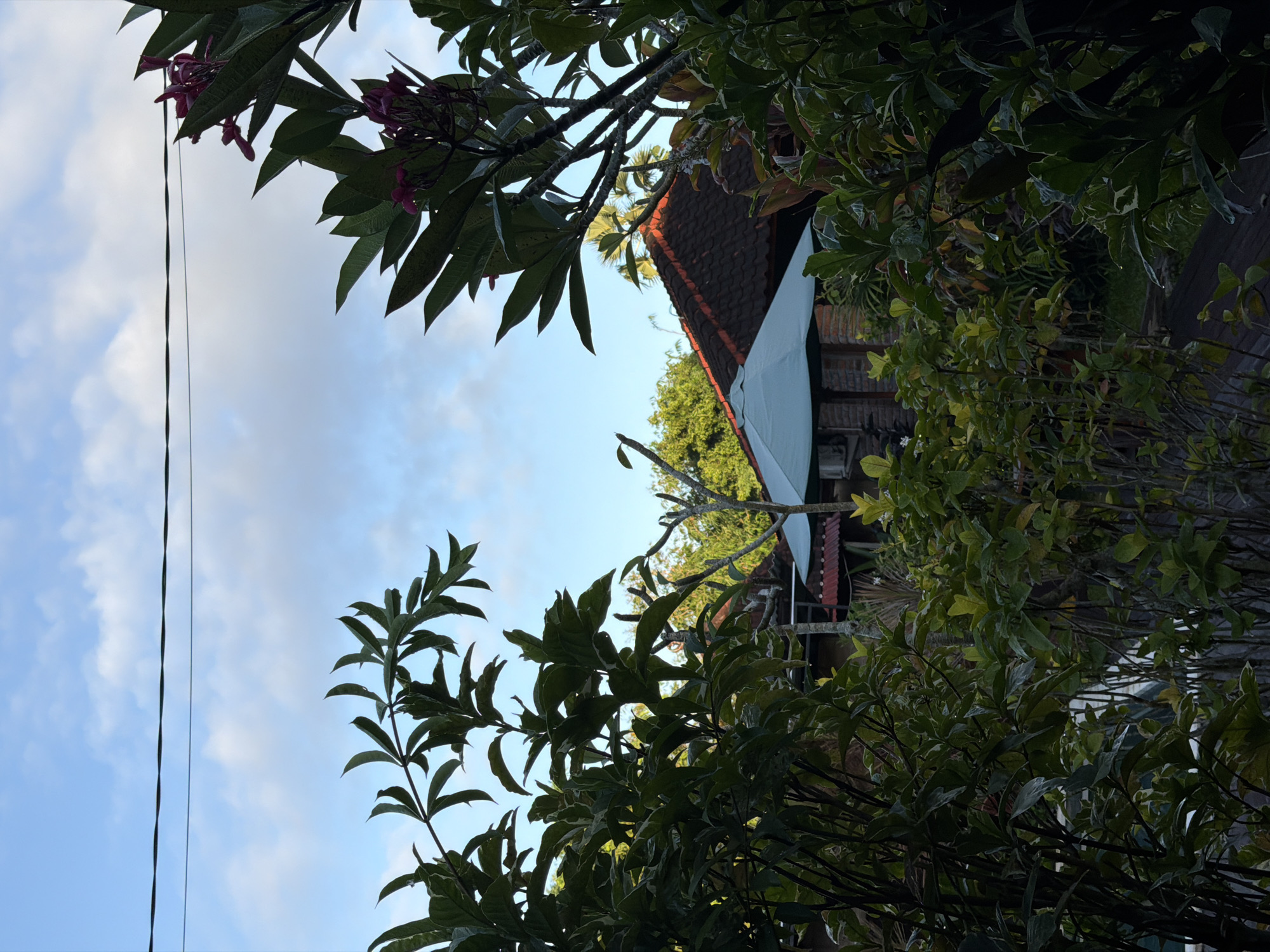 partially obscured view of a building in Kutuh, Indonesia. The shot is taken from a low angle, looking up through foliage. A section of the building's roof is visible, featuring orange tiles and a light-colored gutter or overhang. The sky is visible in the upper left, with wispy clouds. A powerline runs vertically along the left edge of the frame. The foliage primarily consists of green leaves, some with white edges, creating a layered effect.