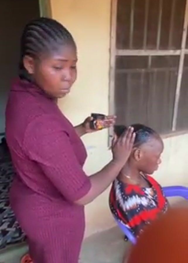 The scene features two women outside near a doorway and a window with bars. One woman, with braided hair and wearing a burgundy dress, is applying hair product to the other woman, who is seated in a blue chair and wearing a colorful shirt. There are slippers near the doorway. The woman applying the product is holding a small, dark container. The environment appears to be a simple outdoor setting, possibly a patio or porch. There is an orange blur partially obstructing the bottom right of the frame.