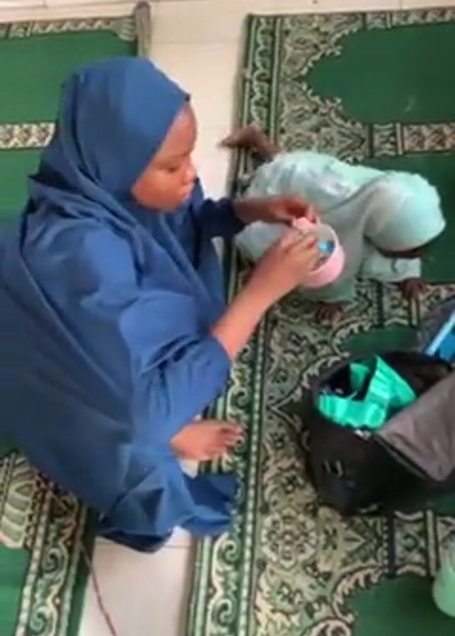 A woman in a blue hijab is sitting on a green carpet in a room with white tile floors, looking directly at the camera while holding a cup with a pink bottom and a white top. She is either inserting objects into the cup or removing objects from the cup. Another person in a light blue hijab is lying on the carpet next to her, also interacting with the cup. To their right is an open black bag filled with green items. A green thermos is also beside the bag. A young child with braided hair is walking around in the scene wearing a white dress. The camera is positioned overhead, providing a clear view of the activities on the carpet.