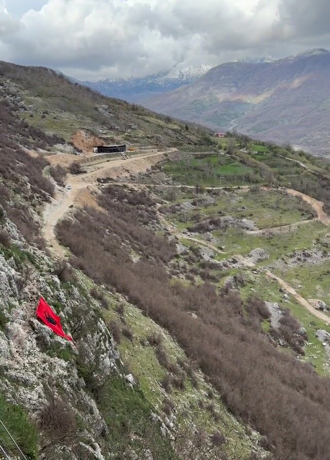 mountainous landscape with a red Albanian flag hanging on a rocky slope in the foreground. A winding dirt road meanders through the hillside, leading towards a building at the top. In the distance, a lake with turquoise water is visible, surrounded by mountains. The sky is overcast with clouds, and some mountains are topped with snow.