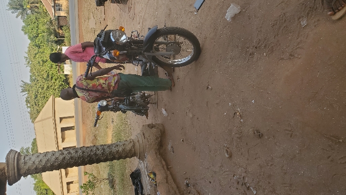Two individuals stand by motorcycles on a dusty surface. One person wears a pink shirt while the other sports a floral pattern top and green pants. A weathered column stands prominently in the foreground, with a building visible in the background across a road. The scene appears to be outdoors.