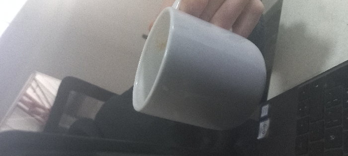 - "A white ceramic mug is held at an angle, revealing a trace of dark liquid at the bottom" by FM-J1hWQ2, licensed under CC BY 4.0