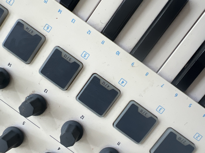 A close-up, high-angle view captures a section of an electronic musical instrument, specifically the control panel and upper keys of a MIDI keyboard controller or synthesizer. The lower left portion of the image shows several white and black piano-style keys. Above the keys, a white control surface displays a series of dark gray, square pads with light gray borders. Visible pads include those labeled "2/10", "3/11", "4/12", "5/13", and "6/14". Blue numbers in square outlines ("2", "3", "4", "5", "6") are positioned adjacent to these pads. Further back on the control surface, multiple dark gray, hexagonal rotary knobs are present, along with black numerical markings (e.g., "11", "12", "13") printed directly on the white surface. The white surface displays minor scuffs and dust accumulation. No individuals, explicit actions, or direct interactions are depicted. The image contains no visual elements to determine a specific location within Mexico City, Mexico.