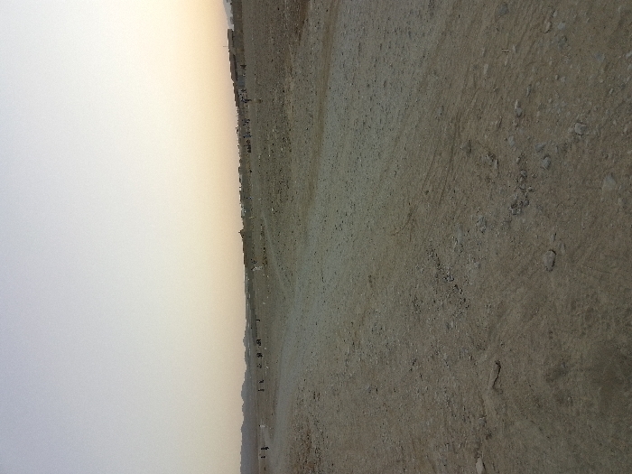 The image displays an expansive, arid outdoor environment at an unspecified location in the city of Unknown, Unknown, under a twilight sky. The foreground is an unpaved, light brown dirt surface interspersed with small rocks and faint ground impressions, indicative of foot or vehicle traffic. This dusty terrain extends into the midground, where multiple indistinct human figures, appearing as dark silhouettes, are scattered across the landscape. On the mid-to-far right, a cluster of rudimentary, low-rise structures with flat roofs forms what appears to be an informal settlement. Additional human figures are visible among these structures. The background features a low, undulating horizon line with distant, indistinct landforms on the far left. The sky above transitions from a pale grey-blue at the top to a soft yellow-orange hue near the horizon. No specific actions or interactions among the individuals are discernible due to distance and image resolution.
