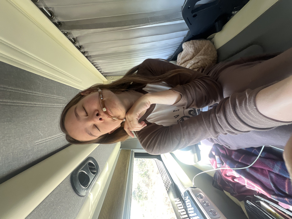 A young female, with long brown hair, is seated inside a vehicle, likely a bus or camper, in Thôn 4, Vietnam