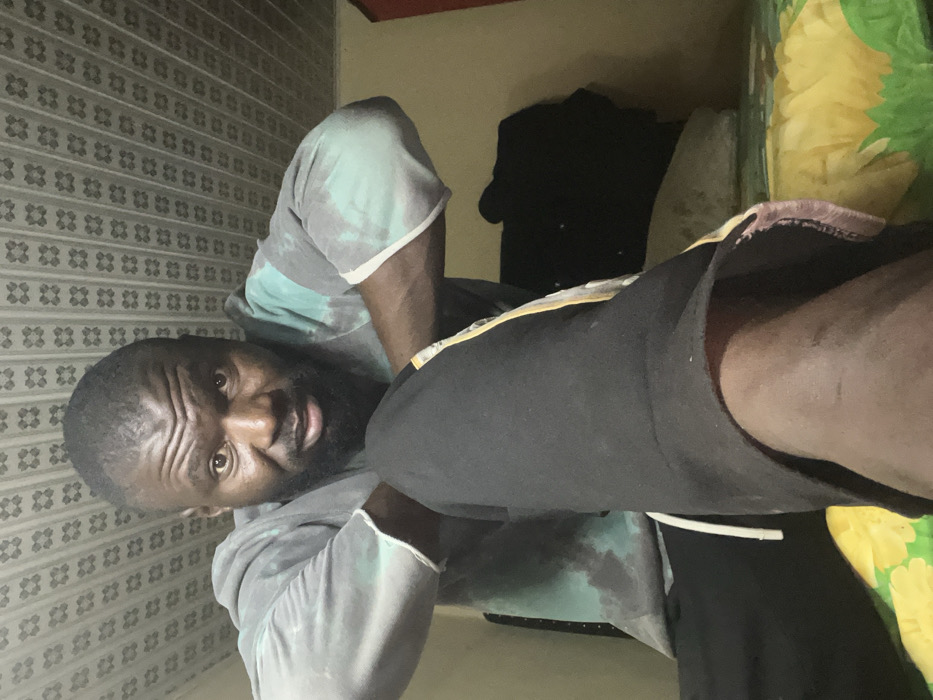 A dark-skinned man with a beard and short hair looks at the camera, wearing a gray and turquoise tie-dye hoodie. He is partially reclined on a surface covered with a yellow and green patterned fabric. The man wears black shorts with a yellow stripe. Behind him is a dark-colored object and a wall with a repeating geometric pattern. The photo has been rotated.