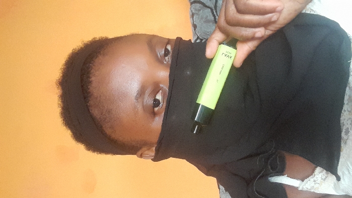 **Location:** Unknown, Unknown. **Description:** A close-up, eye-level indoor photograph depicts an individual with dark skin, short dark hair, and a black headband. Their face is partially obscured by a black fabric, revealing only their eyes which are looking directly at the viewer. The individual wears a white lace-trimmed garment beneath the black fabric. In their right hand, they hold a light green cylindrical vape device with a black tip. The text "AVAJ PLUS" and "COOL MINT" is visible on the device, held horizontally across the lower part of their face, above the black fabric. The background consists of a solid orange wall, with a textured grey and white surface visible on the right side of the frame.