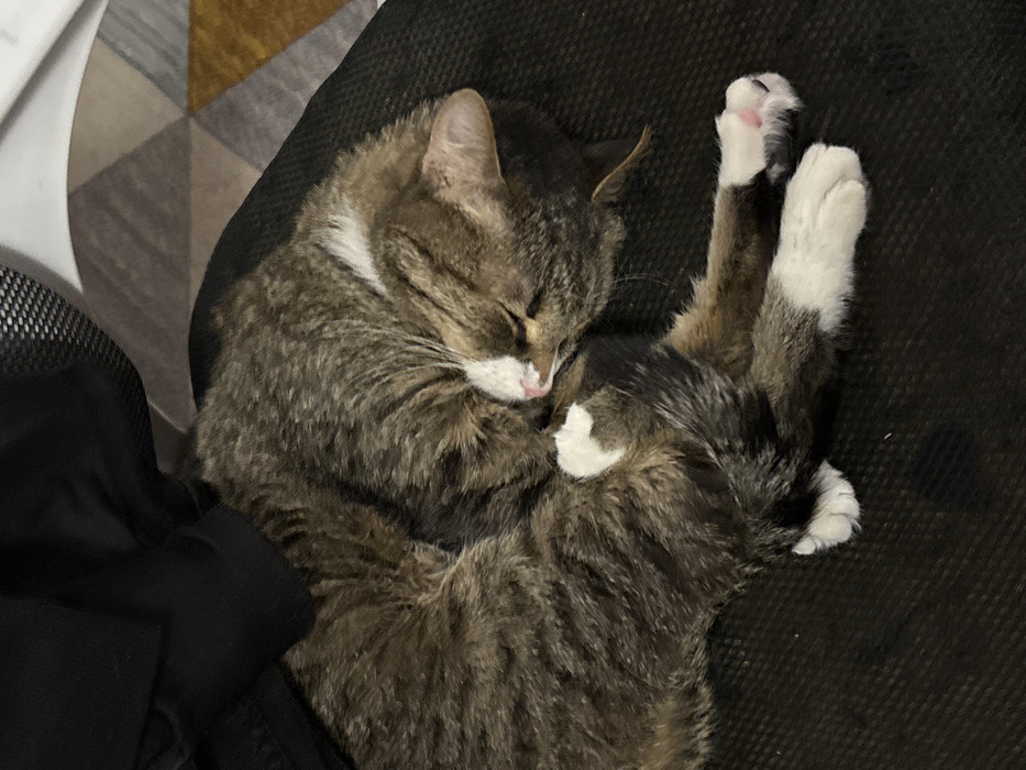 - "A domestic short-haired cat is observed sleeping, curled into a tight posture on a dark grey or black textured surface, likely an office chair, within an indoor setting in the city of Krasny Klyuch, Russia" by FM-oAmG62, licensed under CC BY 4.0