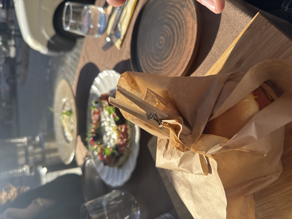 The image depicts an outdoor dining scene at a street-side restaurant or cafe in Sofia, Bulgaria, under bright daylight conditions. In the foreground, a main subject consists of a meal wrapped in brown paper, secured by a wooden clothespin, resting on a small wooden cutting board on a dark brown tablecloth. This wrapped item, partially visible beneath the paper, appears to be a sandwich or burger. To its immediate right, a dark, rustic-textured ceramic plate with concentric ring patterns is present. Further to the right, partially obscured, is a person's hand. In the midground, multiple out-of-focus elements are visible on the table: a glass containing water, silverware (fork and knife) resting on a yellow napkin, a white plate holding a dish artistically arranged in a ring shape with various toppings (possibly tomatoes, berries, and green sprouts), and another white plate with a lighter-colored dish in the background. To the far left, an out-of-focus wine glass and a person's dark-clothed shoulder are discernible. The background shows an urban environment with blurry vehicles, including a light-colored van with a black bumper on the right side of a street. The overall scene is brightly lit by natural sunlight, creating noticeable bokeh effects, indicating an outdoor setting adjacent to a public road in the city. Precise street identification within Sofia is not possible due to the extreme blur of background elements and the absence of unique landmarks or signage.