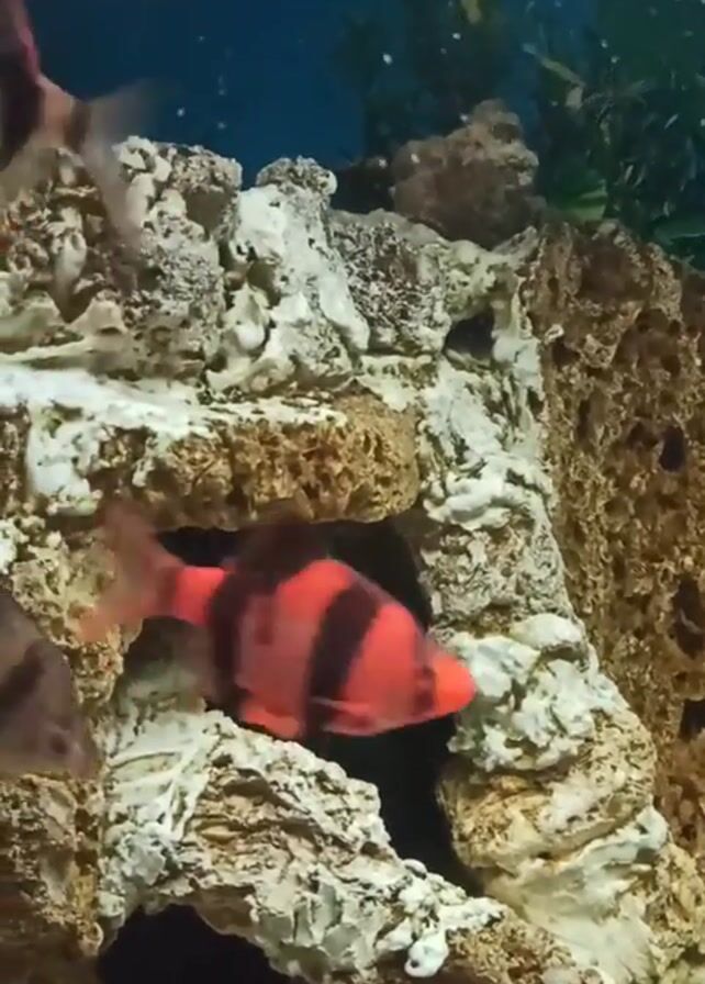 freshwater aquarium. Several tiger barbs are swimming around a decorative rock formation that has artificial green plants behind it. The rocks are tan with white accents, and have several holes that the fish swim around and through. The barbs have black and light brown stripes with red fins. The water is clear and light blue, and there are small white particles floating in it.