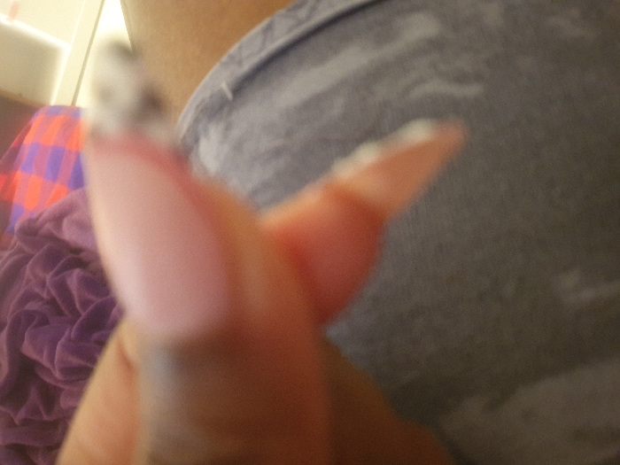 The image displays an extremely out-of-focus, close-up perspective of a human hand in Mumbuni North ward, Kenya. The visible elements consist primarily of a thumb and the distal phalanx of an adjacent finger, exhibiting a medium-brown skin tone. The thumbnail features a light pink or natural-toned artificial nail extension with a pointed or oval tip. The tip of the adjacent finger is covered with an opaque white substance. The hand is positioned over a grey fabric surface, possibly clothing, which shows visible folds. In the blurred background, a mass of crumpled dark purple fabric is visible next to a section of red and purple plaid fabric. A small, unidentifiable, light-colored object with dark elements is discernible but highly blurred near the tip of the thumb. No specific actions or interactions beyond the visible state of the hand and objects can be definitively ascertained.