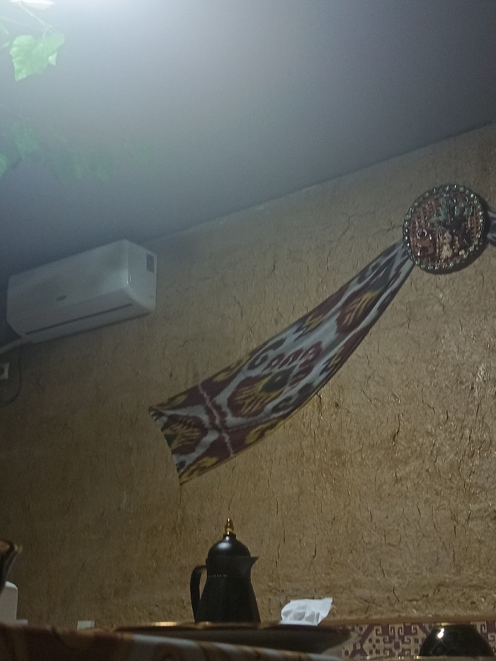 A warmly lit interior features a textured wall adorned with a colorful ikat sash draped to the right, secured with a decorative circular ornament. An air conditioning unit is mounted high on the left. Below, a sleek black teapot sits on a surface with other tableware, possibly a serving or dining area. The room conveys a cultural ambiance.