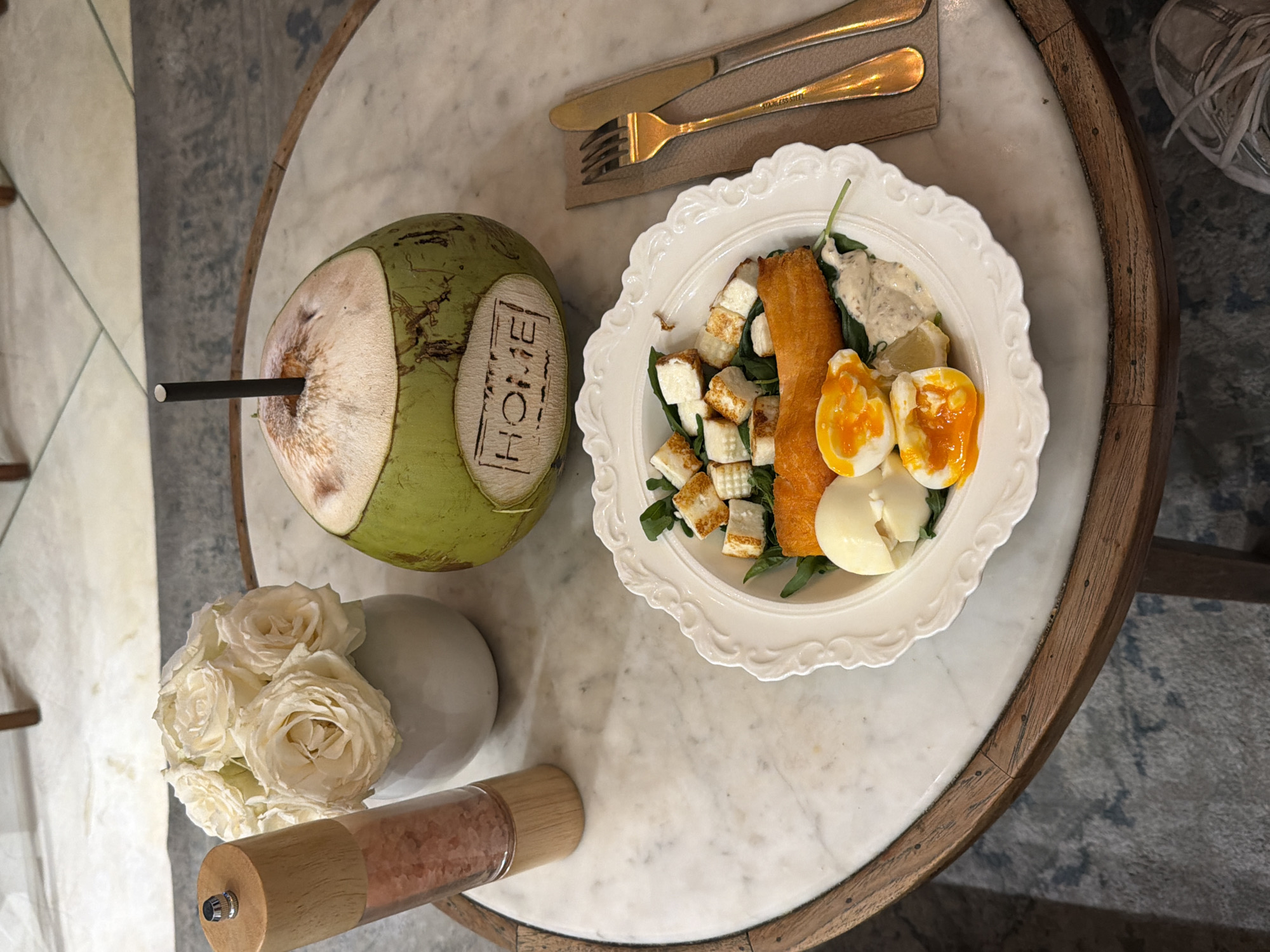 The image displays a meal setting on a round, white marble-top table with a wooden edge, located in Canggu, Indonesia. A white ceramic plate with a scalloped rim holds a salad-like meal consisting of green leafy vegetables, multiple pan-fried or grilled cubes of white cheese, an elongated piece of orange-brown fried food, a whole soft-boiled egg, and another soft-boiled egg halved to reveal bright orange yolks. A small portion of white creamy sauce and a lemon wedge are also on the plate. To the right of the plate, a gold-colored fork and knife are arranged on a rectangular brown paper napkin. Above the plate, a green coconut beverage with a black straw is present; the word "HOME" is carved into the coconut shell facing the viewer. A wooden and clear glass grinder, filled with pink Himalayan salt, stands to the left. Behind the grinder, a small white vase holds a bouquet of approximately six white roses. The immediate environment visible beneath the table includes a patterned grey and blue floor covering. The toe of a person's grey and white athletic shoe is visible in the bottom right corner, indicating human presence. No individuals are otherwise depicted, and no explicit actions are occurring beyond the presentation of the meal.