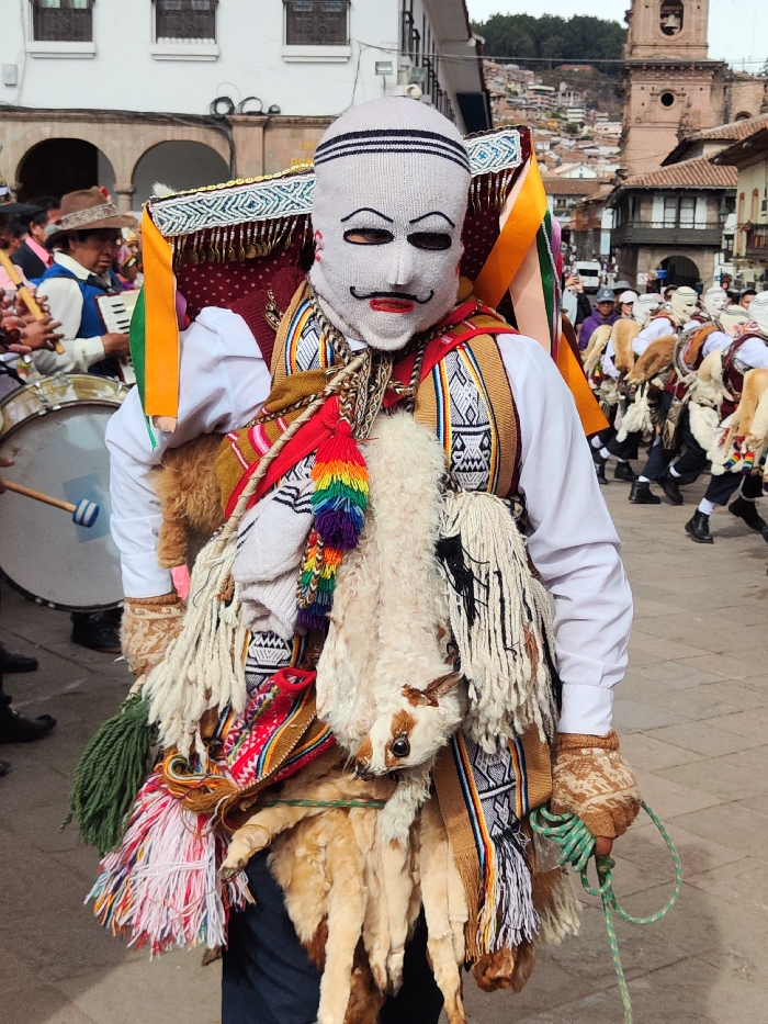 A person in elaborate, traditional Peruvian costume stands on a cobblestone street. The costume includes a knitted mask with painted features, an ornate headdress, and layers of woven textiles. White llama skins hang from the front. A musician with a drum is visible on the left. In the background, a parade of similar costumed figures moves along the street, with buildings of Cusco visible.