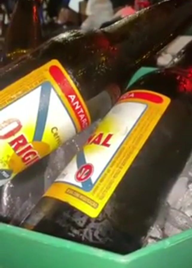 green container full of ice and several bottles of Brazilian beer, including brands like "Original" and "Antarctica