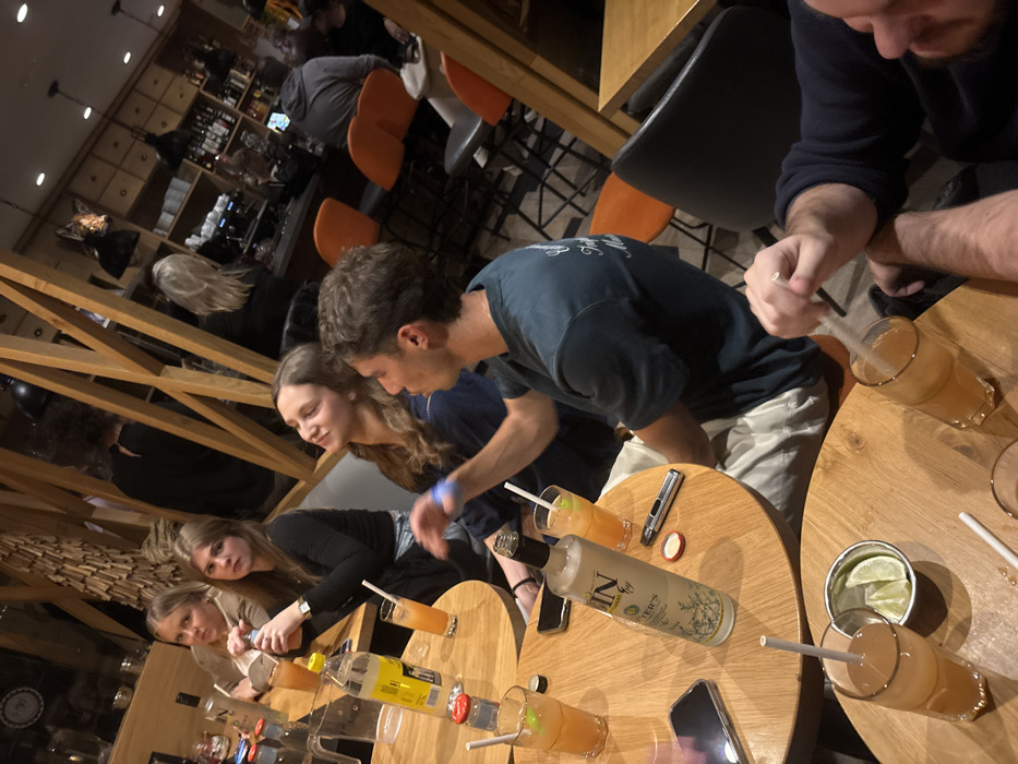A group of people sit at round tables in a bar. Several are drinking cocktails with straws, and there is a bottle of gin on one table. Some people are looking in different directions while others are partially obscured. Behind them, there's a bar with shelves of bottles and a few people sitting on stools. The overall lighting is dim.