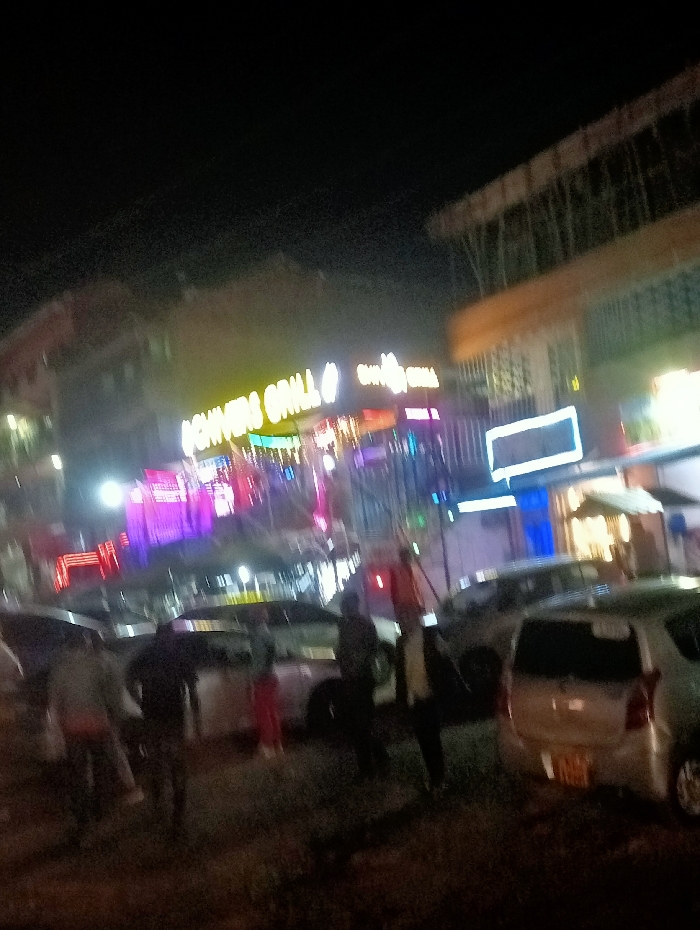At night, people surround parked cars. "KCHINCHIOS GRILL" is lit up above them, along with other neon signs. A building under construction looms on the right, and a building with a red neon sign is on the left.