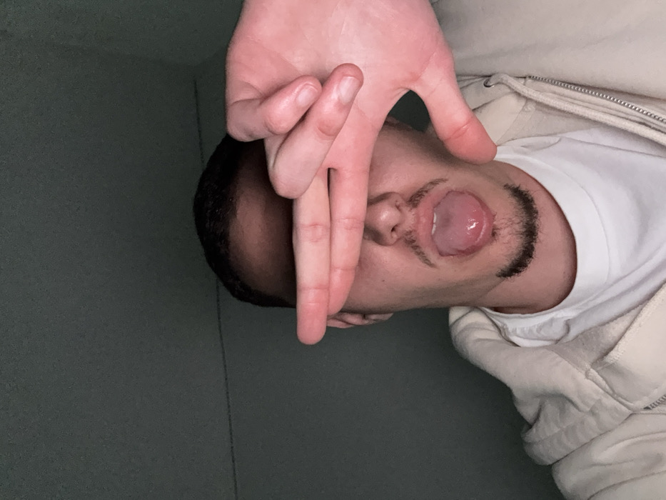The image depicts a close-up, chest-up view of a male individual in a dimly lit indoor setting. The subject, possessing dark, short hair, a mustache, and a goatee, is wearing a light-colored hooded sweatshirt over a white t-shirt. His left hand is raised, with fingers extended horizontally, obscuring his eyes. His tongue is extended from his mouth. The background consists of a plain, dark surface, potentially a wall or ceiling, with a subtle horizontal demarcation line visible in the upper left quadrant. No specific location within the city of Sofia, Bulgaria, can be determined from the visual evidence.