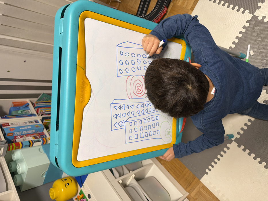A child in a blue long-sleeved shirt stands drawing on a turquoise and yellow easel. The child's back is towards the camera, showing brown hair. The easel displays drawings of buildings, circles, triangles, and spirals in blue and red. The easel stands near a white shelf unit with toys, books, and a yellow Lego head. The floor has a gray and white puzzle mat.