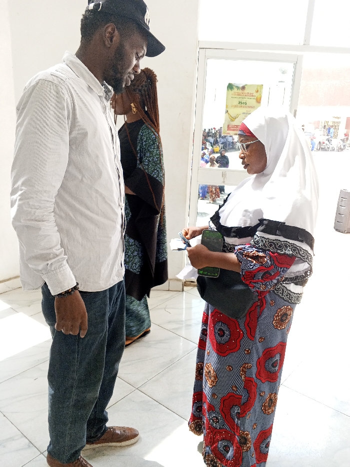The scene depicts an indoor area, likely a public building or event space, in Lokoja, Nigeria, with an outdoor area visible through a glass door