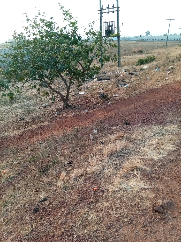 This image depicts an outdoor, semi-rural environment in Durimi, Nigeria. A narrow, reddish-brown dirt path traverses the foreground, angling from the lower right to the upper left. To the left of this path, a single deciduous tree with green foliage is prominently situated. The ground surrounding the tree and alongside the path consists of reddish-brown earth, sparsely covered with dry, light-brown grass and some green weeds. Numerous pieces of litter, primarily white and colored plastic bags and wrappers, are scattered across the terrain, particularly visible in the mid-ground to the right of the tree. In the mid-ground towards the right, a utility pole system stands, featuring at least two poles supporting an electrical transformer and associated overhead wiring. Further in the distant background, a flat expanse of dry, open land extends, behind which a line of low-rise buildings with light-colored roofs is visible under a pale, featureless sky. No individuals or animals are present within the frame. The scene presents an unpopulated area with visible infrastructure and refuse.