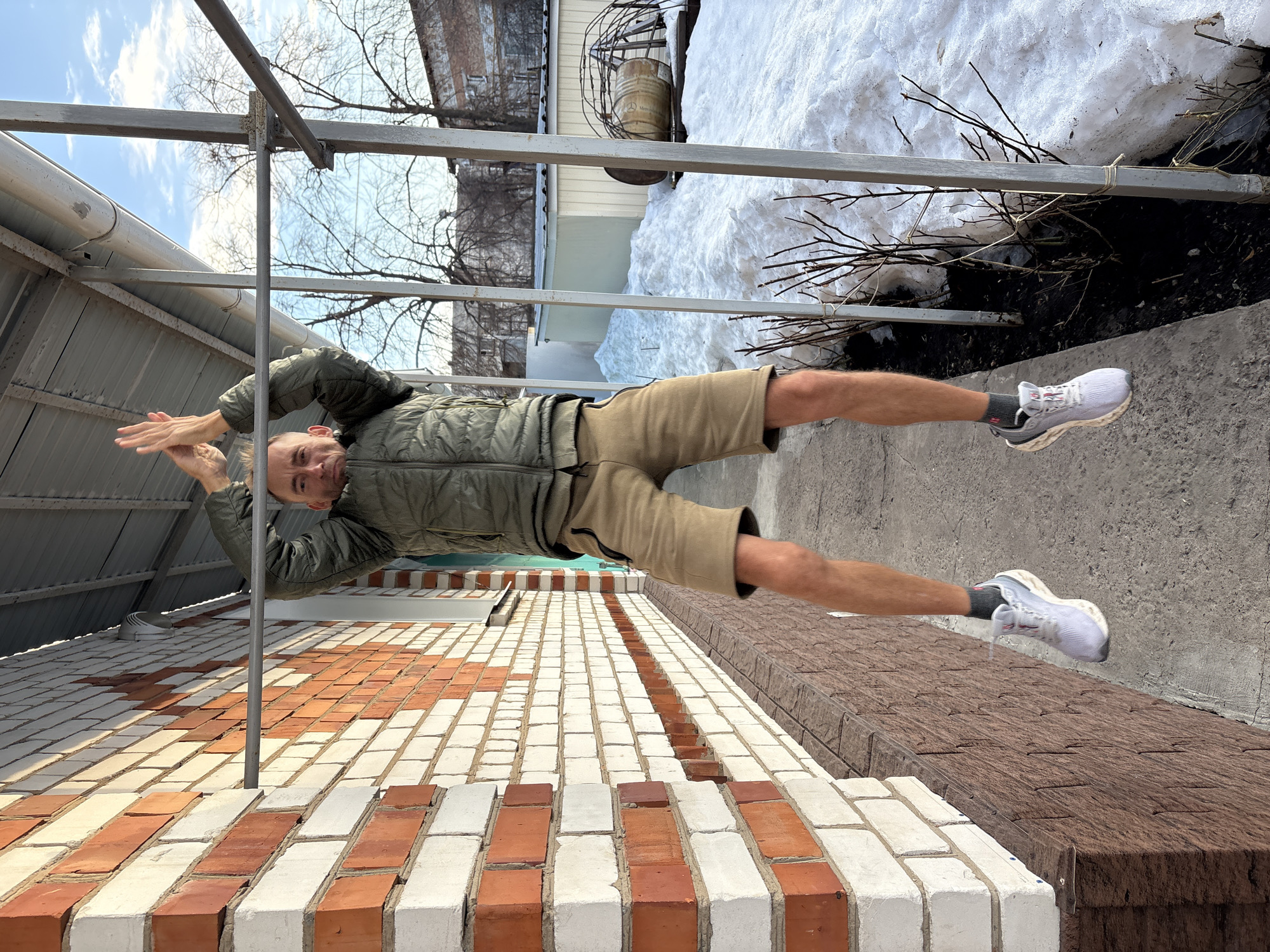 A male subject is depicted suspended in the air, gripping a horizontal metal bar outdoors in Ulyanovsk, Russia. The subject, appearing middle-aged with short hair, wears a dark olive green quilted jacket, tan shorts, grey socks, and light grey athletic shoes. His hands are clasped above his head, palms together, while his feet are approximately 15-20 centimeters off the concrete ground. He maintains an intense facial expression. The horizontal bar is secured to a building wall on the left, constructed from alternating white and red bricks, with a brown, textured foundation-level facade. The bar extends to the right, supported by an unpainted metal frame structure that also supports a corrugated metal awning overhead. To the right of the metal frame, a significant accumulation of melting snow covers the ground, revealing patches of dark earth and bare, twiggy bushes. In the snow-covered area, a light-colored barrel, possibly featuring a Mercedes-Benz logo, and an adjacent metal frame structure are visible. The background reveals bare deciduous trees and residential or utility buildings under a clear blue sky with scattered white clouds.